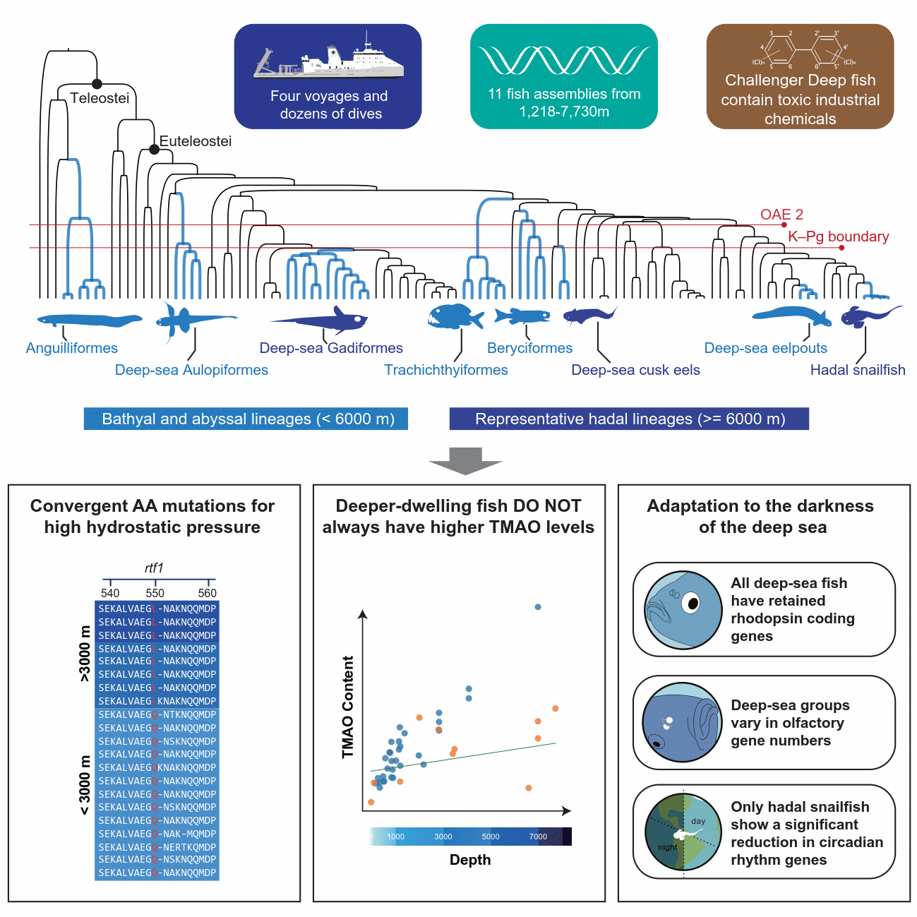 研究對從西太平洋至中印度洋海域,深度1218米到7730米水深,超深淵海溝、海盆和斷裂帶,熱液區(qū)及中國南海海域捕獲的11種深海魚類的基因組數(shù)據(jù)進(jìn)行深入分析,構(gòu)建了深海魚類的"生命進(jìn)化樹",揭示了脊椎動(dòng)物征服深淵的史詩歷程。結(jié)果表明,大多數(shù)現(xiàn)存的深海魚類約在6500萬年前的大滅絕事件后才進(jìn)入深海區(qū)域,而少數(shù)更古老的深海魚類類群在1億年前就已經(jīng)開始適應(yīng)深海環(huán)境,并可能在連續(xù)的大滅絕事件中存活。進(jìn)一步的研究發(fā)現(xiàn)深海魚類基因組展現(xiàn)出較低的突變速率和較高的重復(fù)序列比例,同時(shí),對深海黑暗環(huán)境也表現(xiàn)出不同層次的適應(yīng)性變化。